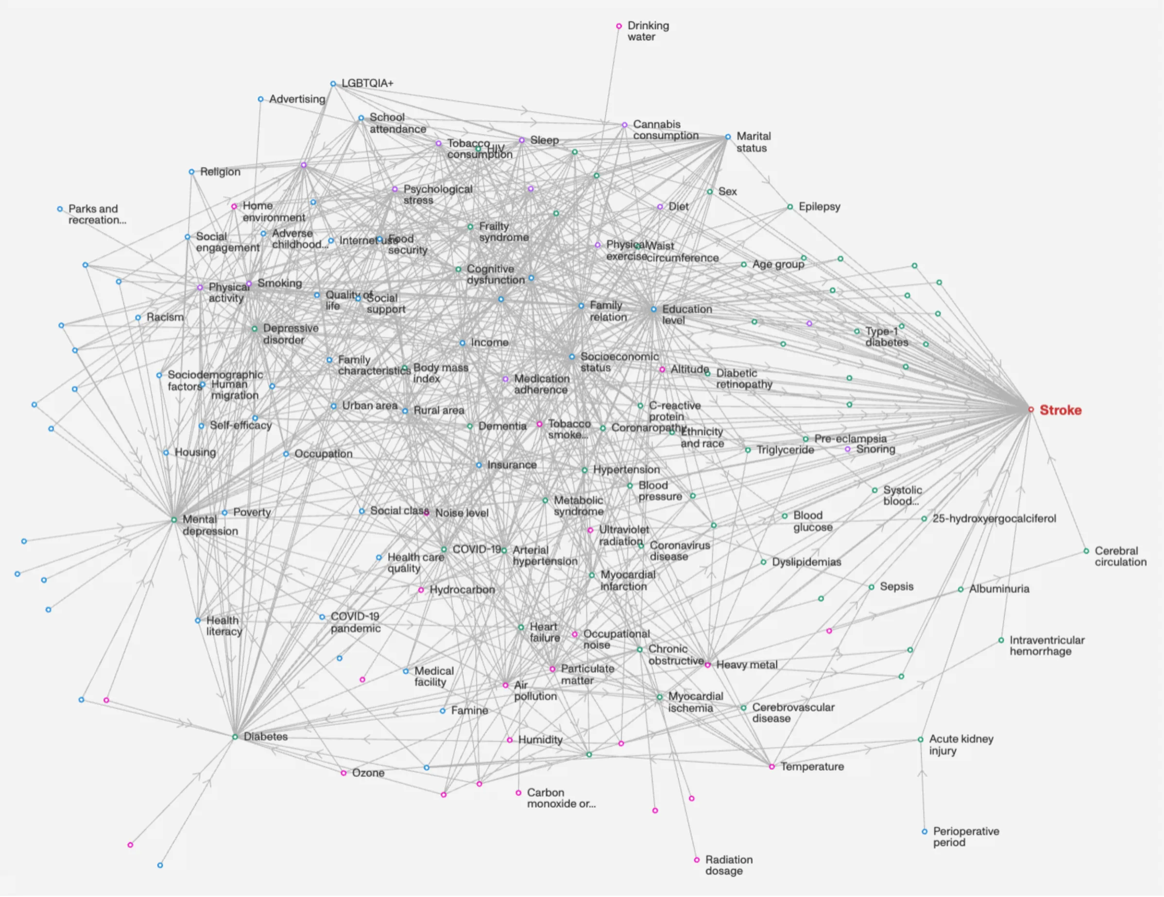 Leveraging the System Graph, System and The Novartis Foundation identified 14 key social and environmental determinants of stroke, AMI, HF, and ESRD and potentially important mediating paths. The scale of the System Graph enables rapid identification of targets for intervention to improve health outcomes. Ultimately, this work will be used alongside other efforts, like the work being done across multiple city populations by the AI4HealthyCities team, to guide decision making over how best to allocate limited resources to improve cardiovascular health.