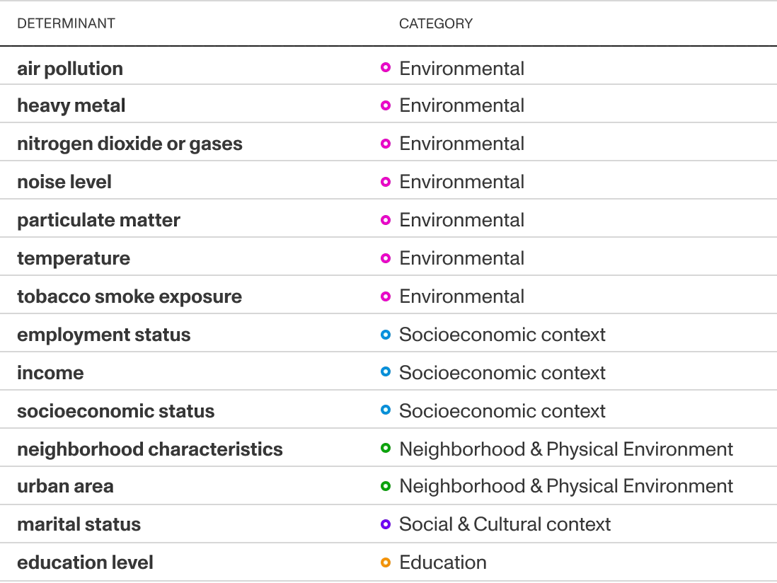 From a starting set of 2,513 determinants of HF, ESRD, Stroke, and AMI, a final list of 14 determinants was identified based on a number of studies supporting the impact of those determinants on one of our target outcomes. The results included environmental determinants such as air pollution, particulate matter, nitrogen dioxide, heavy metal exposure, noise level, temperature, and tobacco smoke exposure, and social determinants such as education level, employment status, socioeconomic status, income, neighborhood characteristics, geographic area, and marital status.