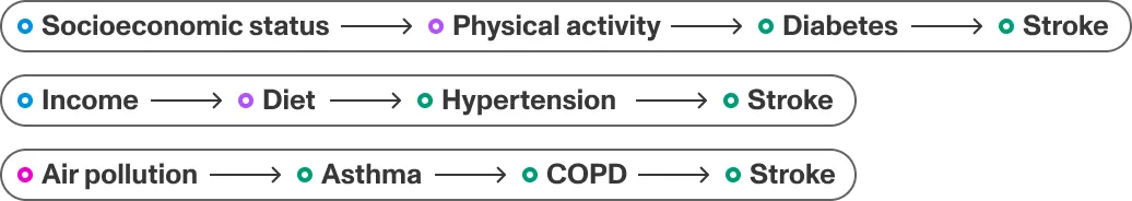 For example, the relationship between diabetes and stroke in the System Graph is backed up by 553 extracted statistical findings. We can also use the System Graph to start to identify potential causal pathways from the literature. For example:
